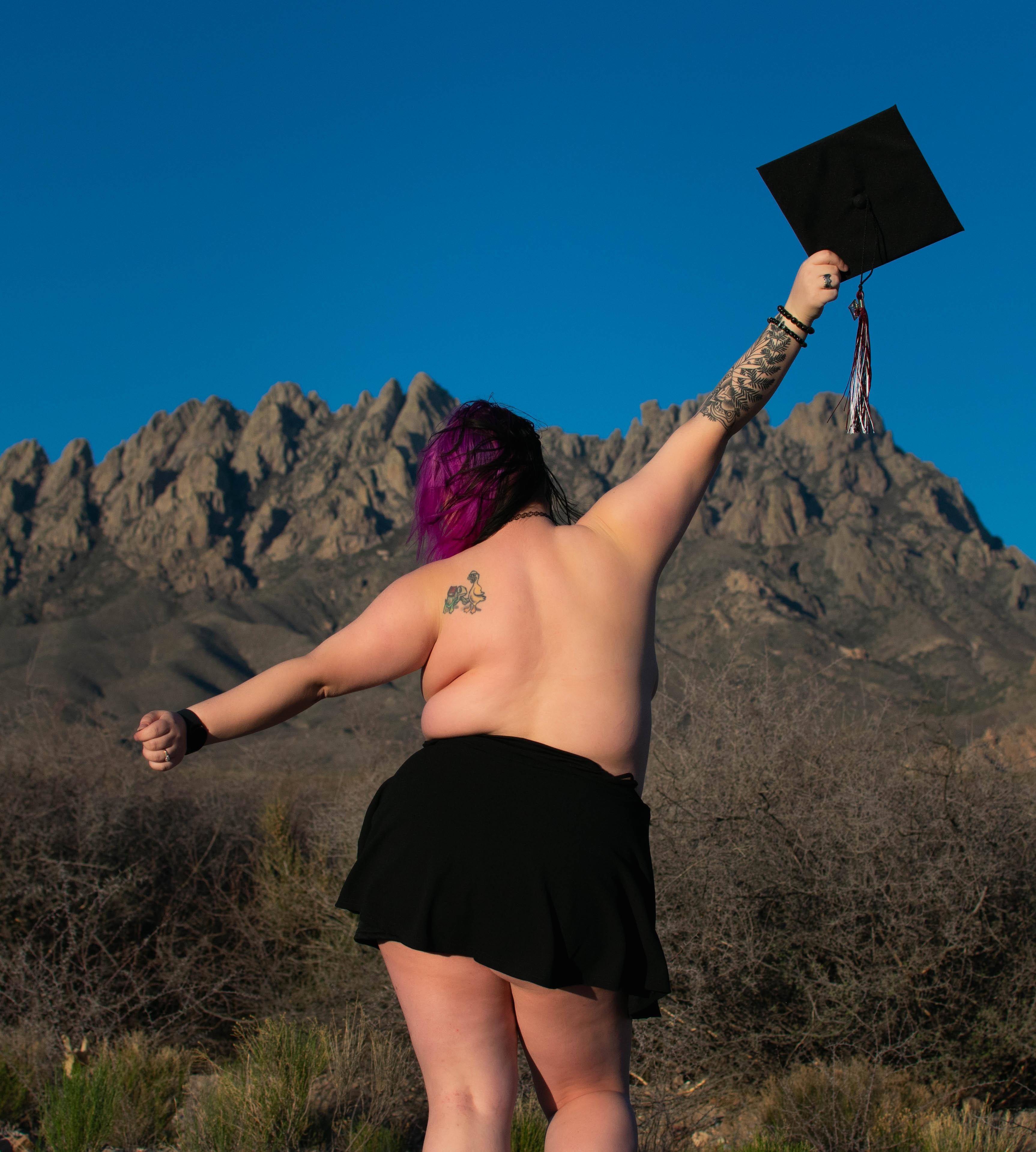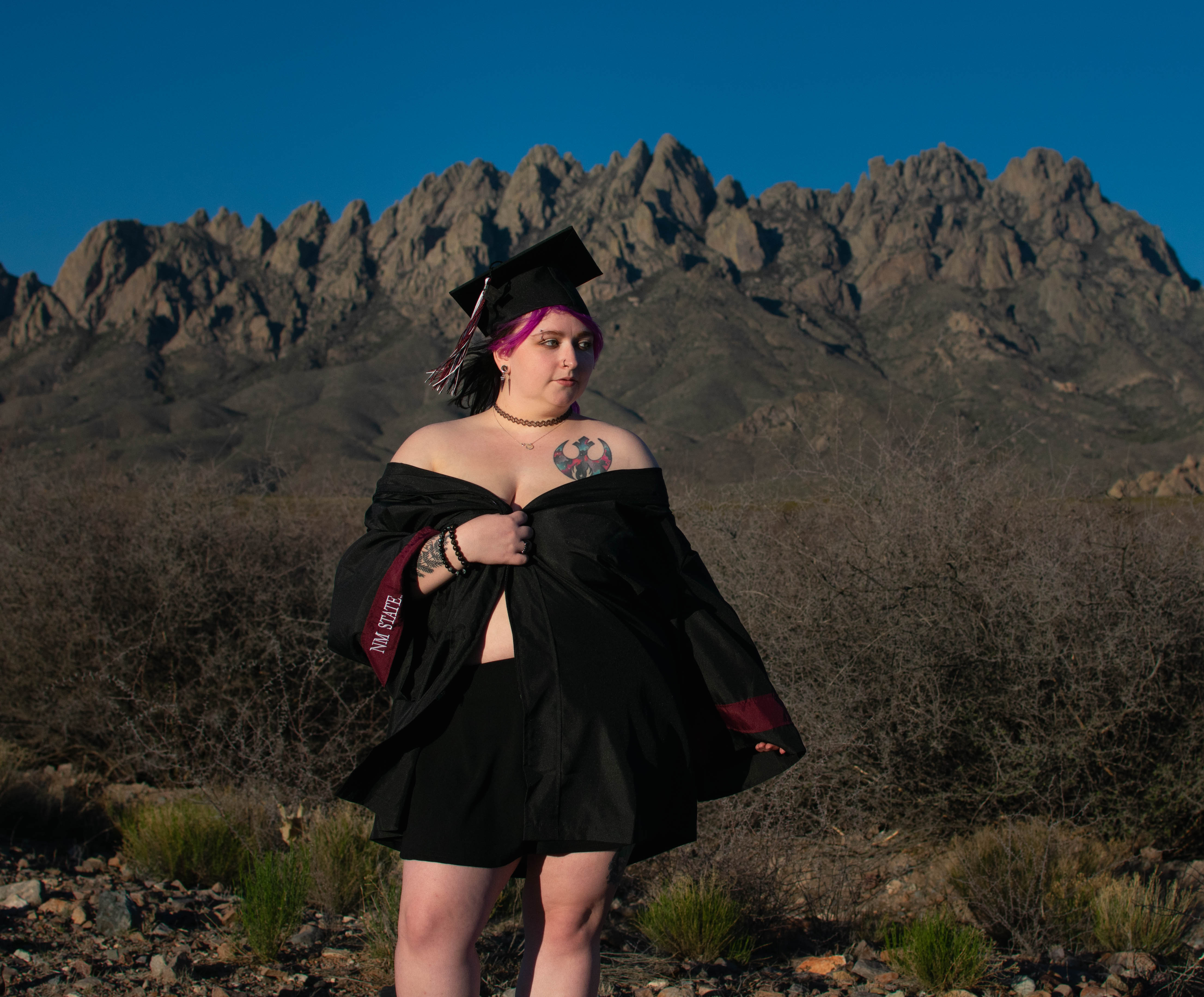 We started on the college campus with traditional graduation photos—cap, gown, and all. But after capturing the milestone moments, we moved to the desert, where the dramatic backdrop of the Organ Mountains set the stage for something entirely unique. We traded the typical poses for more boudoir-inspired moments, incorporating the cap and gown in creative, revealing ways that brought out the model’s confidence and individuality.