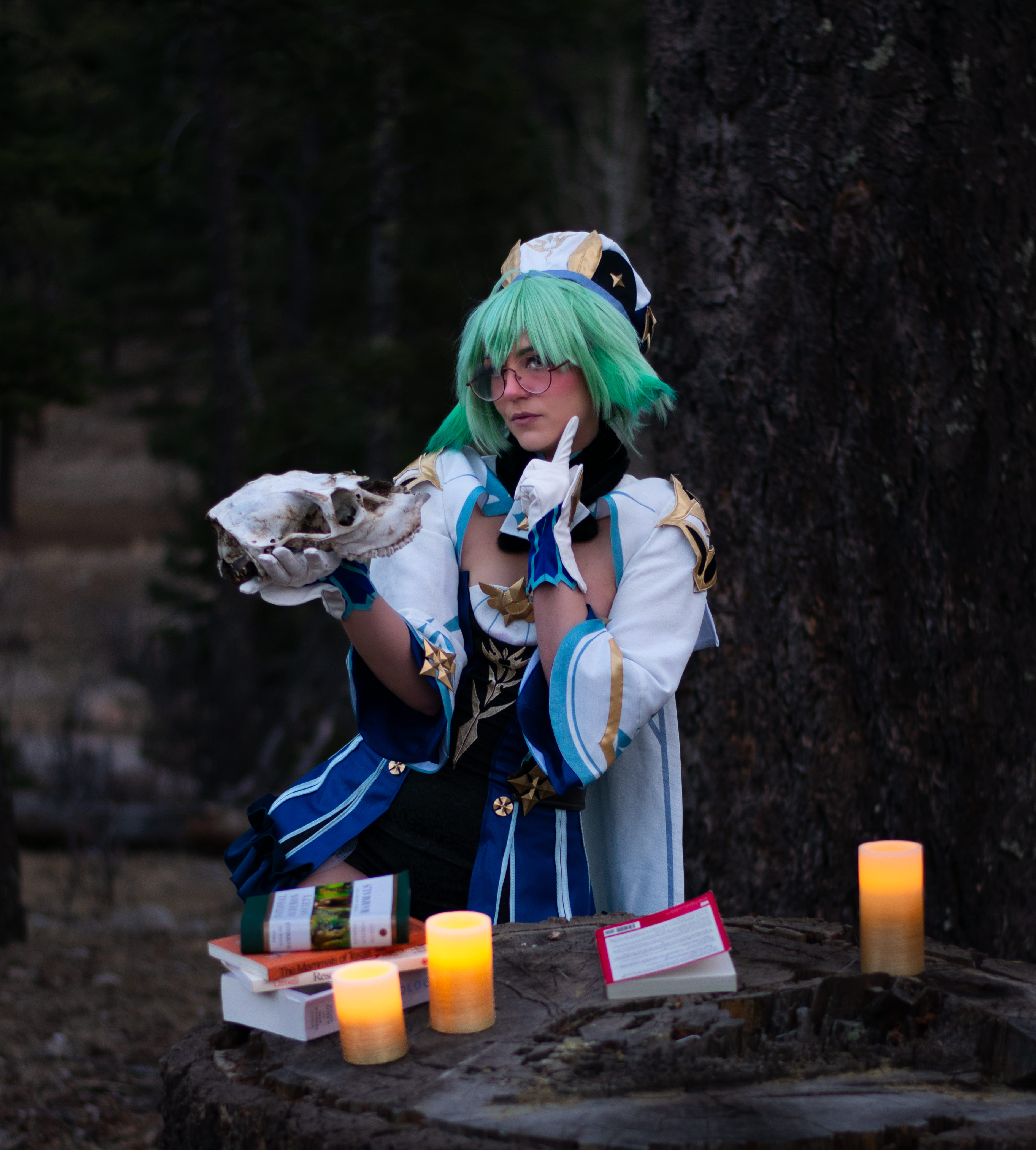 Dari drove up from El Paso, TX to work with me, and she did not disappoint. She was dressed as Sucrose, a character who is an alchemist and botanist, always studying plants, fungi, and bones. We created a reading nook in the woods for her character to study.